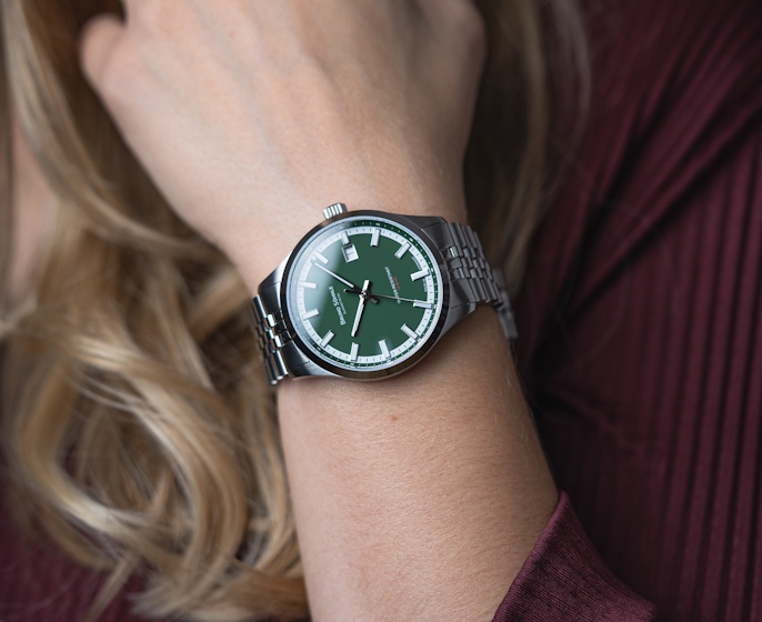 Quarzwerk in veredelter Bruno Söhnle-Ausführung (Basiswerk Ronda 6003.D), Gehäuse Edelstahl, Zifferblatt blau, Ø 34,0 mm, Höhe 9,1 mm, 10 bar, Saphirglas innen entspiegelt, Metallband Edelstahl, Faltschließe