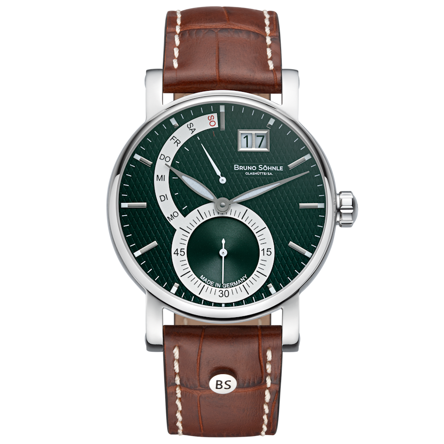 Quarzwerk in veredelter Bruno Söhnle-Ausführung (Basiswerk Ronda 7004.P), Gehäuse Edelstahl, Ø 43,0 mm, Höhe 13,65 mm, 10 bar, Saphirglas innen entspiegelt, Lederband braun, Faltschließe