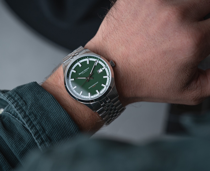 Die Turin Automatik präsentiert sich in moderner Zwischengröße mit 39,5 mm Durchmesser und einer schlanken Höhe von nur 11,6 mm. Ihr veredeltes Automatikwerk, das Atelierkaliber BS 175, zeichnet sich durch Perlage auf Grundplatine, Automatikbrücken und Unruhkloben aus. Ein eigens entwickelter Rotor sowie thermisch gebläute Schrauben komplettieren das anspruchsvolle Uhrwerk. Das matte, aufgeräumte Zifferblatt in elegantes Tannengrün verleiht der Turin Automatik eine zeitlose Ästhetik und verbesserte Lesbarkeit. Mit einem verschraubten Boden und einer verschraubten Krone ist die Uhr bis zu 10 BAR wasserdicht.