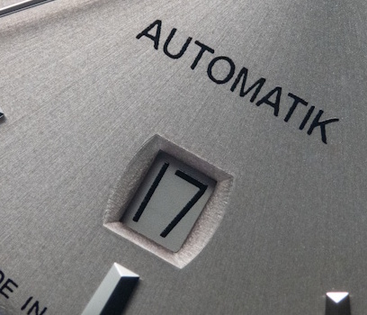 Das Datum auf 6 Uhr ist elegant in das Zifferblatt eingelassen und überrascht mit einer gefärbten Zifferblattscheibe.