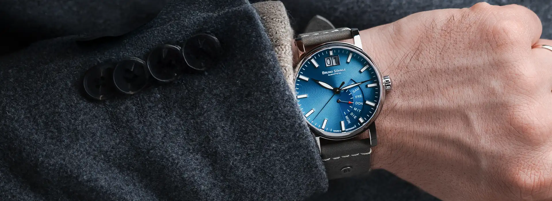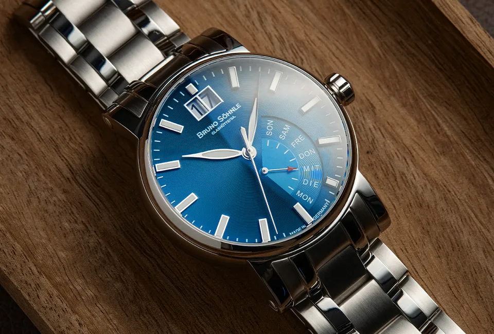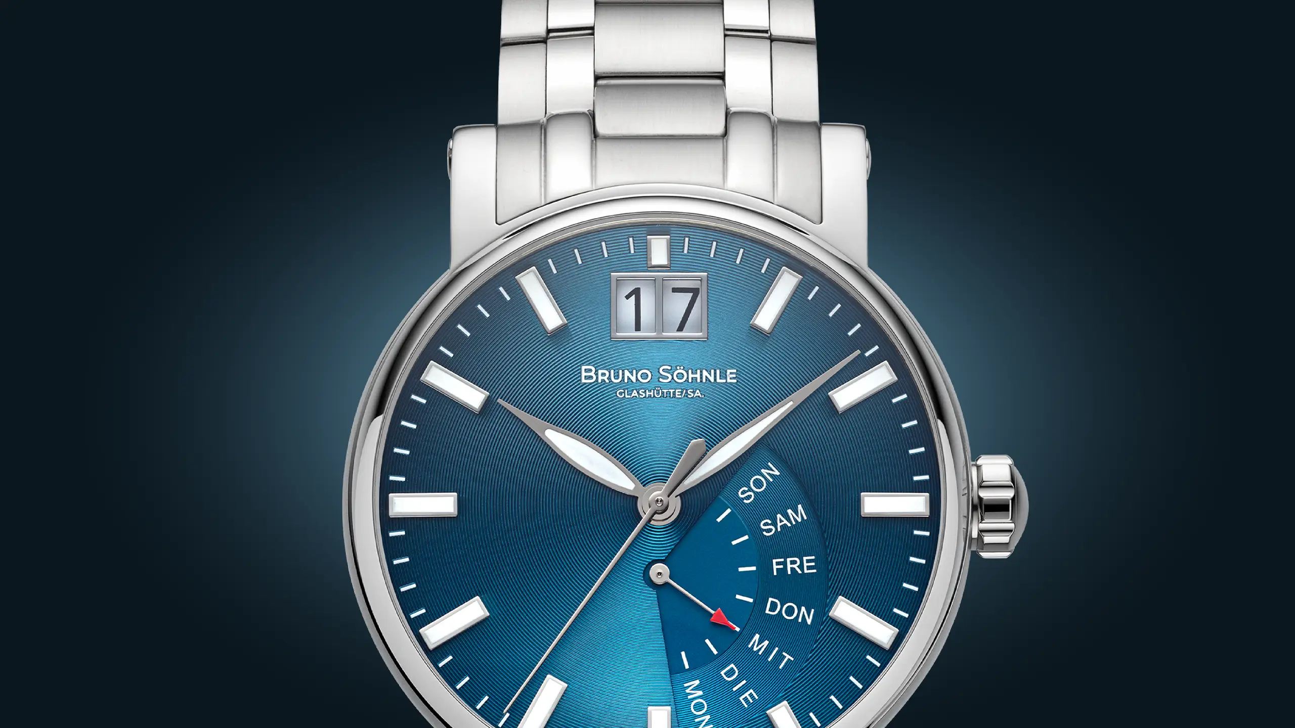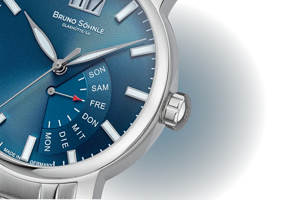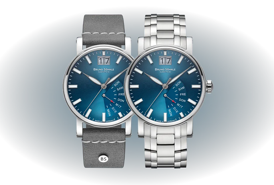 Dank der harmonisch integrierten Day-Date-Funktion und des fein gearbeiteten, ozeanblauen Zifferblatts spiegelt die PESARO I unter dem gewölbten und entspiegelten Saphirglas den hohen Anspruch deutscher Uhrmacherkunst aus Glashütte eindrucksvoll wider. Das Großdatum mit zwei übereinanderliegenden Datumsscheiben steht nicht nur bei Bruno Söhnle für Glashütter Tradition.