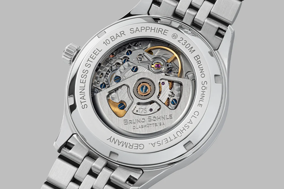 Der sichtbare Glasboden der Turin Automatik „Bright Red“ gewährt einen exklusiven Blick auf das in unserem Atelier fein veredelten Atelierkaliber BS 175. Zahnräder, Brücken und rotierende Schwungmasse bewegen sich in perfekter Harmonie – ein faszinierendes Zusammenspiel aus präziser Mechanik und Glashütter Handwerkskunst. Jeder Blick offenbart die Liebe zum Detail und die aufwendig veredelten Komponenten, die diesem mechanischen Meisterwerk seine unverwechselbare Aura verleihen.