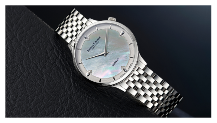 Quartz movement in refined Bruno Söhnle version (Base movement Ronda 1062), Stainless steel, Ø 35 mm, Height 6.0 mm, 3 bar, Sapphire glass with anti-reflective coating inside, Metal strap Stainless steel, Folding clasp, 4 brilliant-cut diamonds (WSi / 0,005 ct each stone)